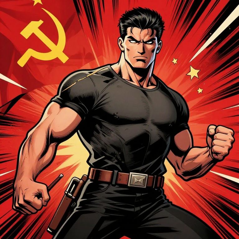 Muscular man in black shirt and pants, with pistol, fists clenched, against red background with hammer and sickle, stars, and dynamic lines