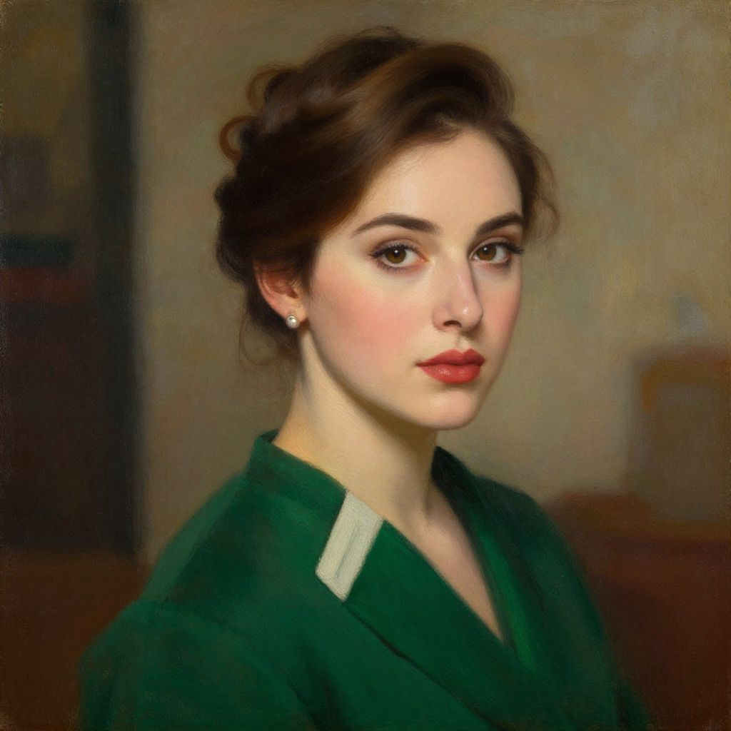 This captivating portrait features a woman with elegantly styled hair, exuding a sense of sophistication and grace. Her striking presence is accentuated by the rich green of her outfit, set against a softly lit background that enhances the overall composition. The artwork reflects a blend of classic and contemporary painting styles, showcasing meticulous detail and vibrant colors.