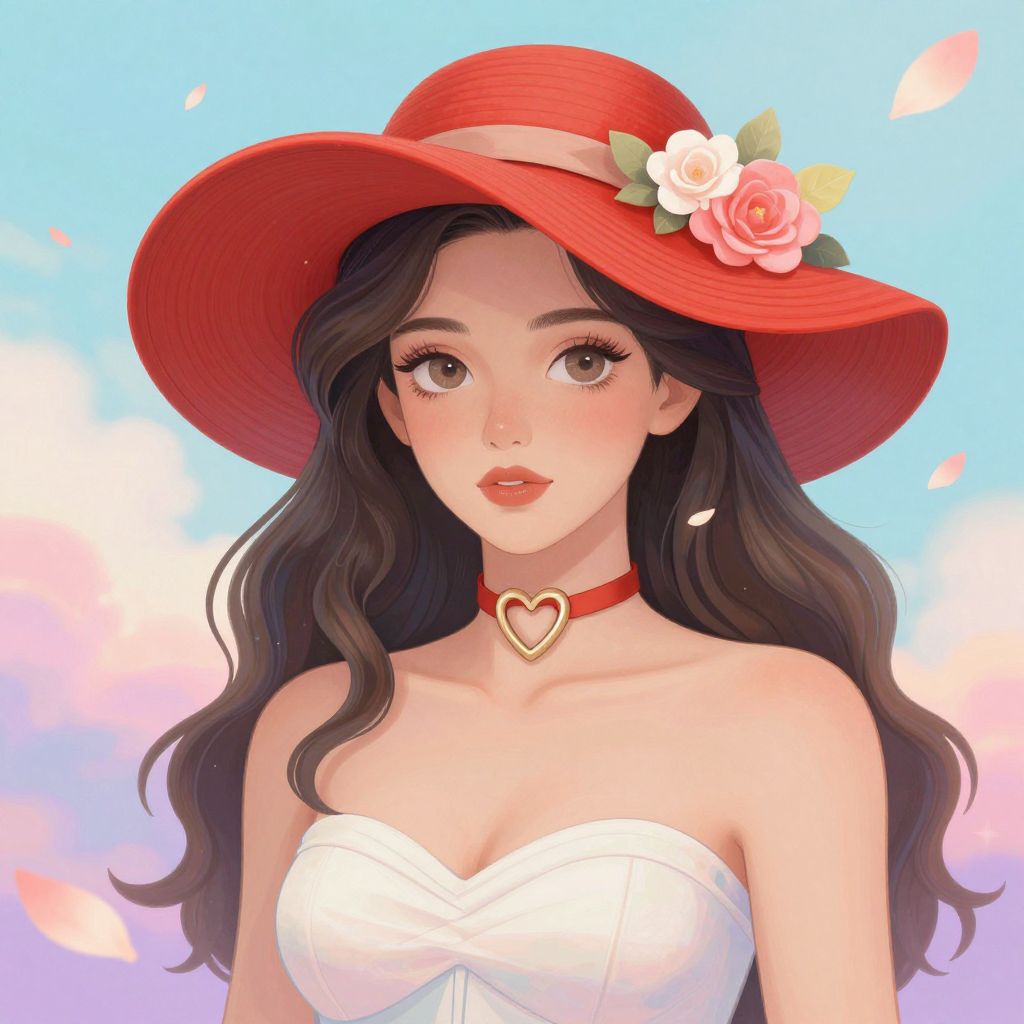 A vibrant digital illustration inspired by \"Venus\" by Sonia Liao, featuring a woman adorned in a red sunhat with floral accents, a heart-shaped choker, and a strapless dress, set against a dreamy backdrop of floating petals and soft, ethereal lighting.