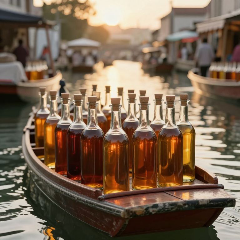A serene canal scene bathed in golden-hour lighting showcases a floating market where rows of glass bottles, each containing amber-colored liquids and corked with wooden stoppers, reflect the ever-changing moods of potential buyers, evoking a sense of nostalgia and mystery in this high-definition, computer-generated depiction.