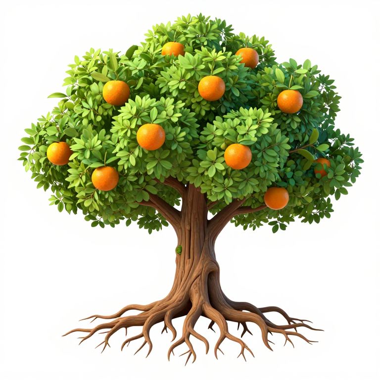 A vibrant digital illustration depicts a whimsical tree with lush green foliage and orange fruits, its roots sprawling outward and upward, symbolizing the surreal act of harvesting clouds as if they were fruit, blending fantasy with natural elements in a high-definition, cartoon-style rendering.