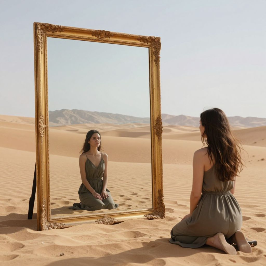 In a vast desert expanse, a woman kneels before a golden-framed mirror that defies reflection, revealing instead a parallel world where her mirrored counterpart sits in reverse, both gazing into an endless horizon of dunes and distant mountains, blurring the line between reality and illusion.
