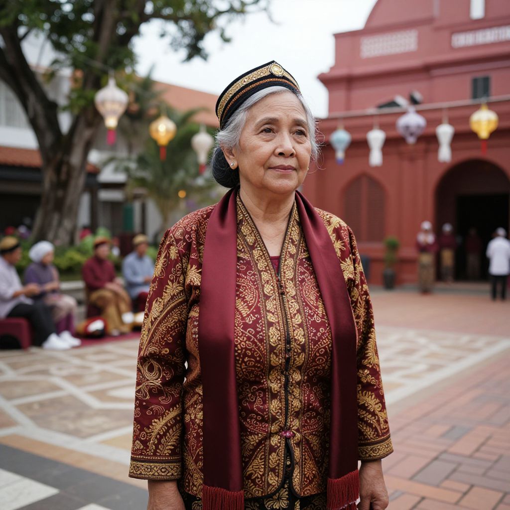 An older woman with a wise face, fair skin, and silver-streaked hair, wearing a traditional Malay costume with rich red and gold batik patterns, a long silk scarf draped over her shoulders, and a traditional headdress, standing in a quiet rural mosque courtyard in Malacca, during a cultural heritage celebration with lanterns and traditional music in the background.. The woman has big breasts and cute face