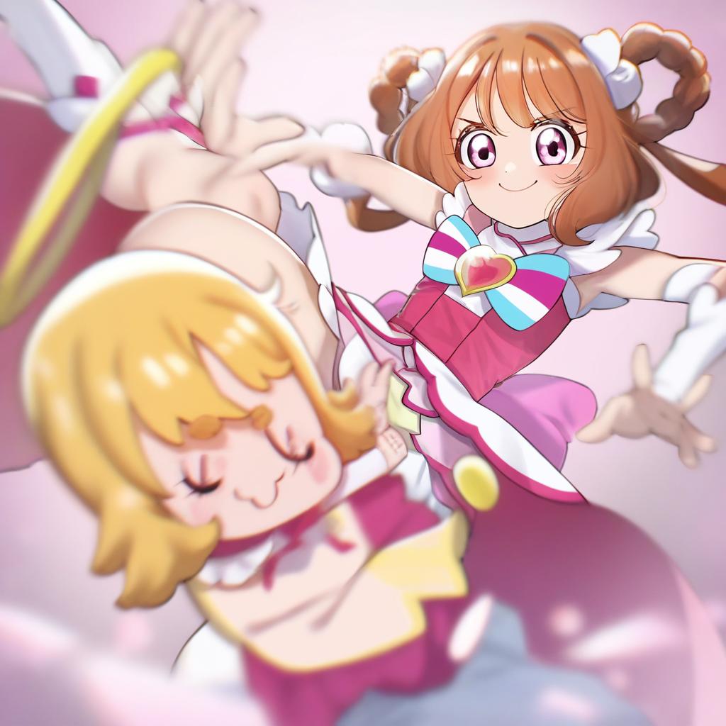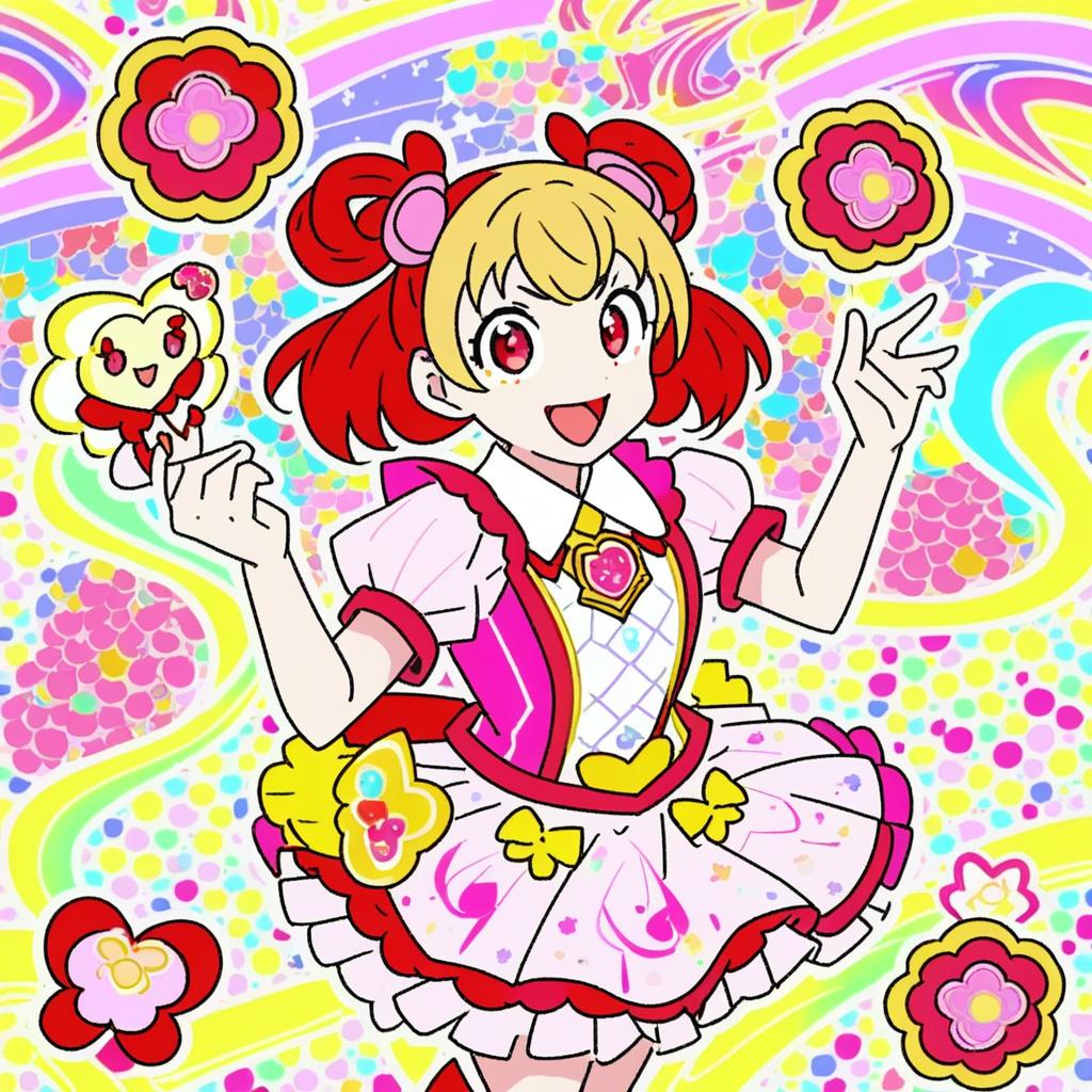 Hanamichi ran, delicious party precure, 1girl, red eyes, brown hair, blonde hair, short hair, medium hair, hair rings, magical girl, by artist ramanda, leet