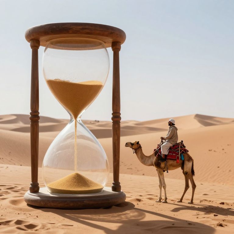 Camel-mounted traveler pauses beside a colossal hourglass as golden sand cascades through its glass chambers, casting a timeless shadow over the vast desert landscape.