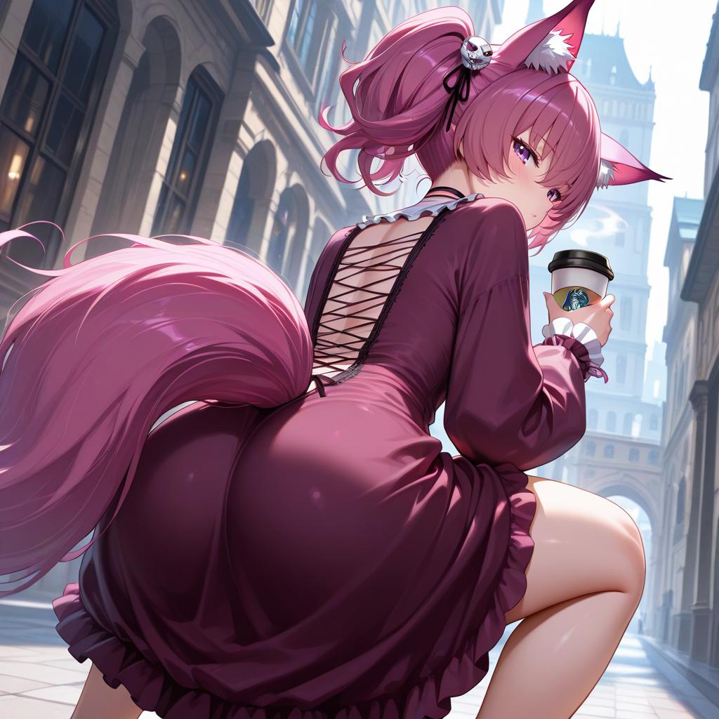 Digital illustration of an anime-style girl with pink hair and fox ears wearing a maroon backless dress. She is squatting in a simple urban cityscape with classical architecture, holding a coffee cup with a black lid. The girl has purple eyes and her hair styled with a ribbon and a small skull accessory. The setting features a bright, clear sky and a tall clock tower in the background.