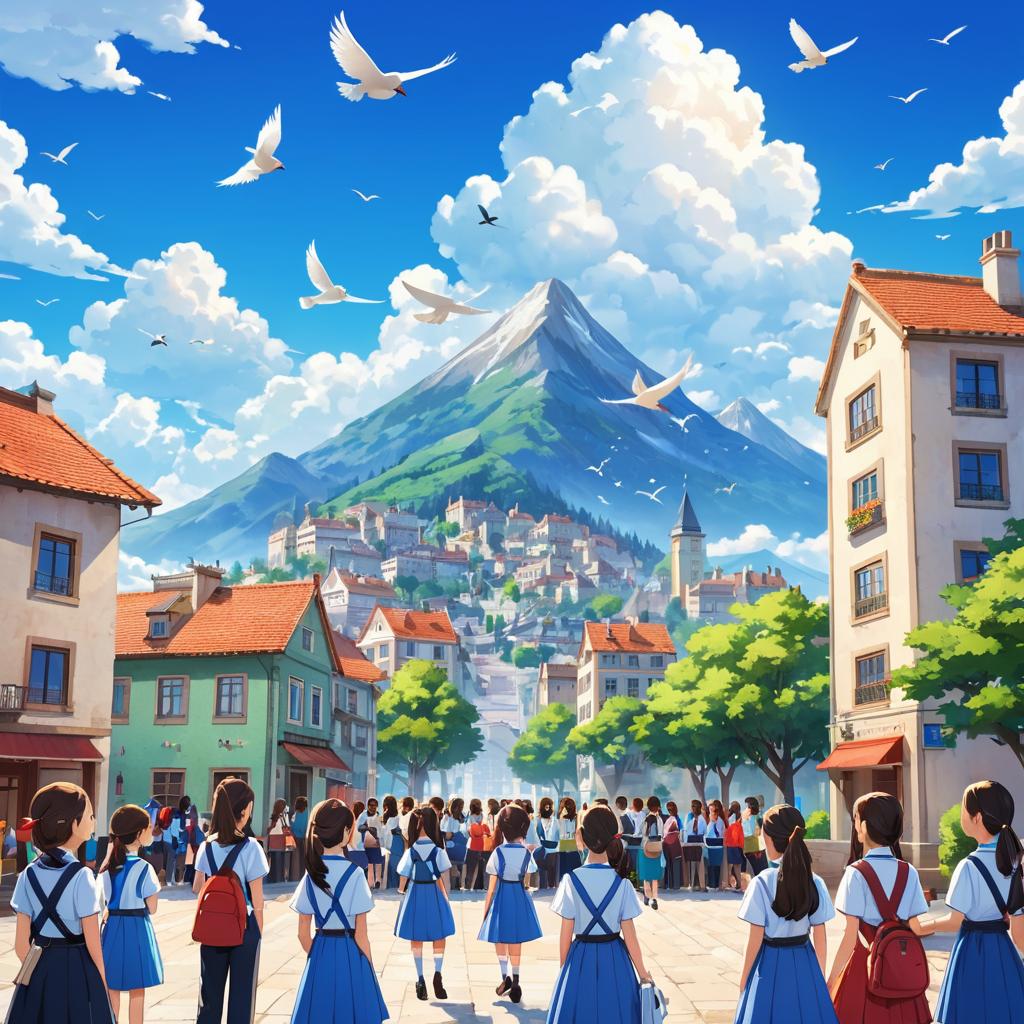 Cloud, outdoors, sky, mountain, day, tree, blue sky, scenery, building, 6+boys, bird, people, crowd, mount fuji, multiple girls, multiple boys, 6+others, house, town, city, ligne claire, mountainous horizon, 6+girls, cloudy sky, multiple others