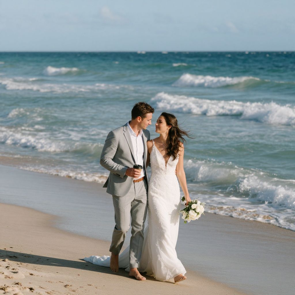 Windswept bride and groom share a tender moment on Palm Beach, with the ocean's gentle waves behind them and the man holding a coffee cup as they walk along the sandy shore.