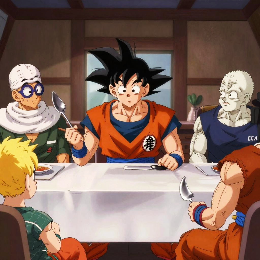 Illustration featuring Totoro and various characters sitting at a long dining table inspired by the Last Supper painting. The scene is quirky and dreamlike with an array of food, drinks, and items on the white tablecloth. The background is dark, emphasizing the characters and their expressions. Totoro stands prominently in the center with a small green leaf on its head, surrounded by anime-style characters in colorful clothing.