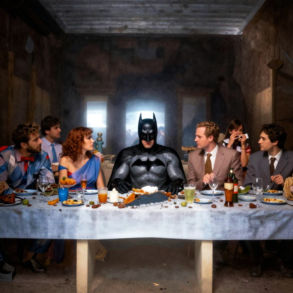 Totoro at the Last Supper table, quirky and dreamlike scene