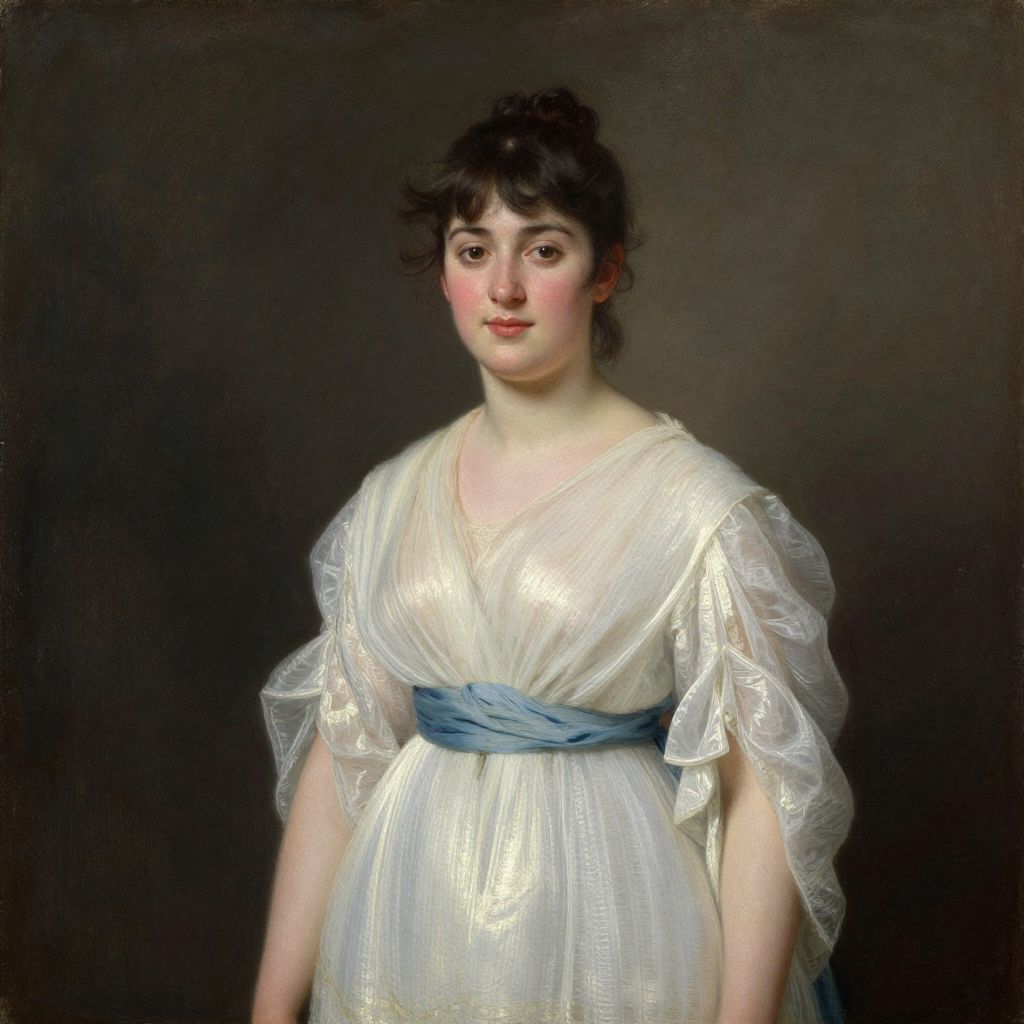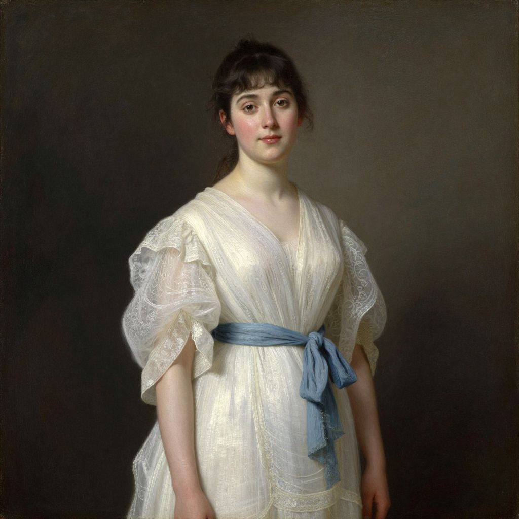 This is a classic oil painting portrait of a young woman with pale skin and dark brown, slightly curly hair. She has a soft, round face with pink cheeks and a gentle expression. She is dressed in a white, translucent, shimmery gown with puffed sleeves that are slightly sheer. A blue sash is tied around her waist, adding a contrasting color to the otherwise white dress. The background is dark and unobtrusive, which makes her figure stand out. The painting has a realistic style with smooth, delicate brushstrokes, and the lighting highlights the softness of her skin and the texture of her dress.