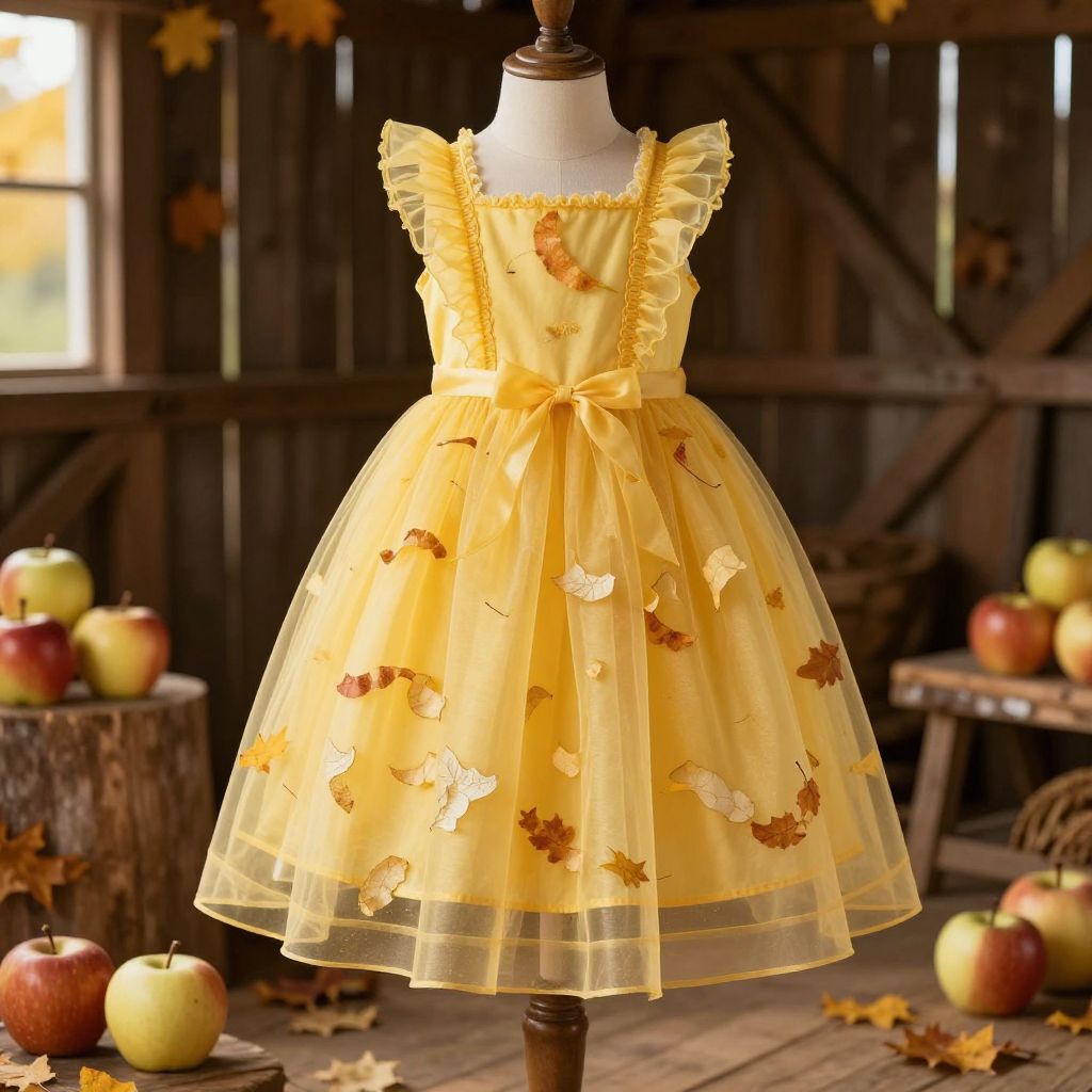 Yellow apple dress inspired by autumn harvest, layered with translucent fabric resembling apple peels, set in a rustic barn with warm, golden light and wooden accents.