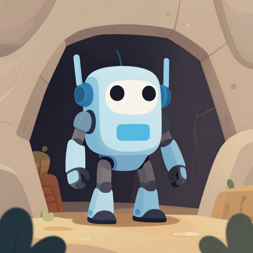 "Cybernetic old rocky stone cave , children´s book illustration style, simple, cute, full color, flat color, cute Pixar style illustration,"