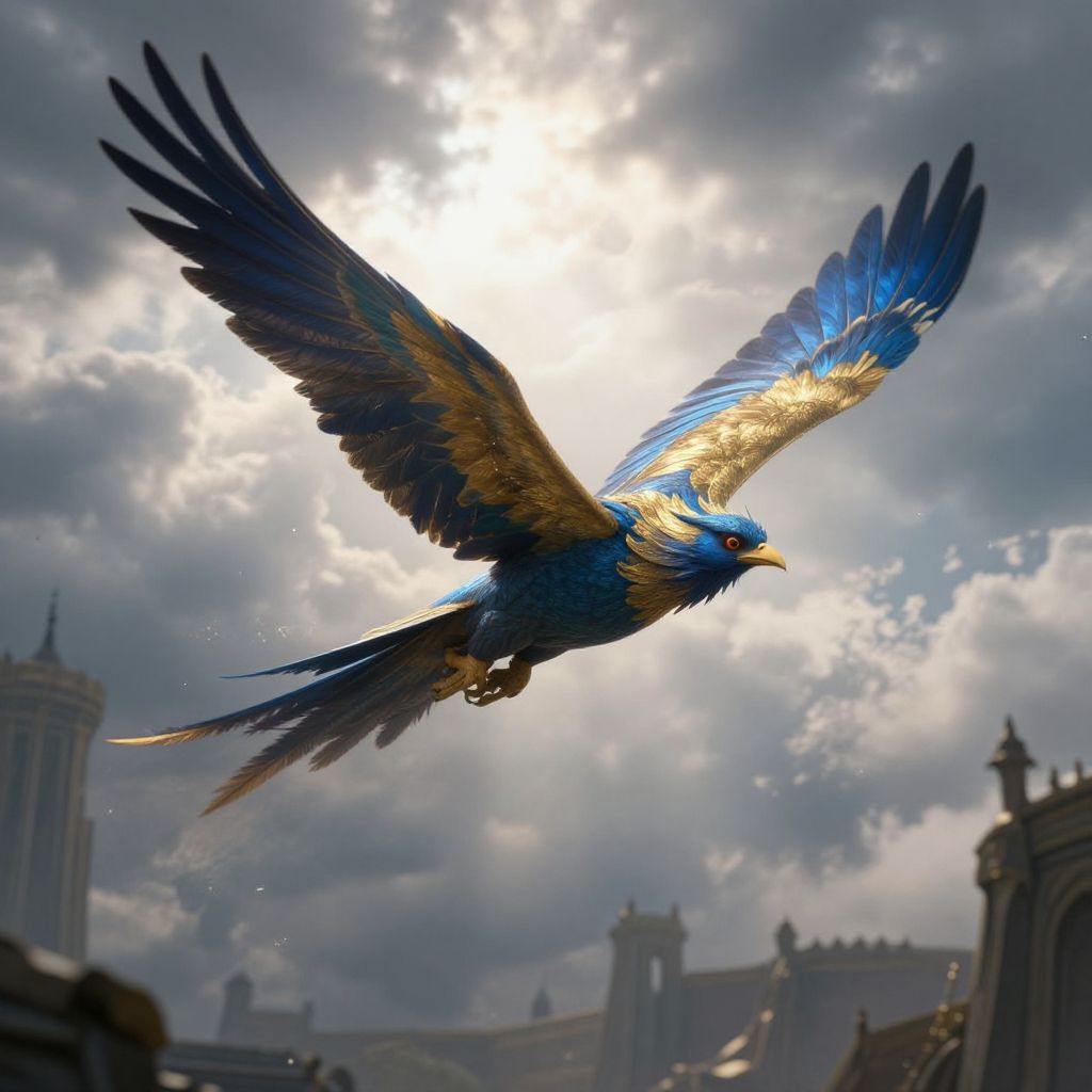 Digital artwork of a blue and gold winged bird with a red eye soaring against a cloudy, sunlit sky with medieval buildings in the background.