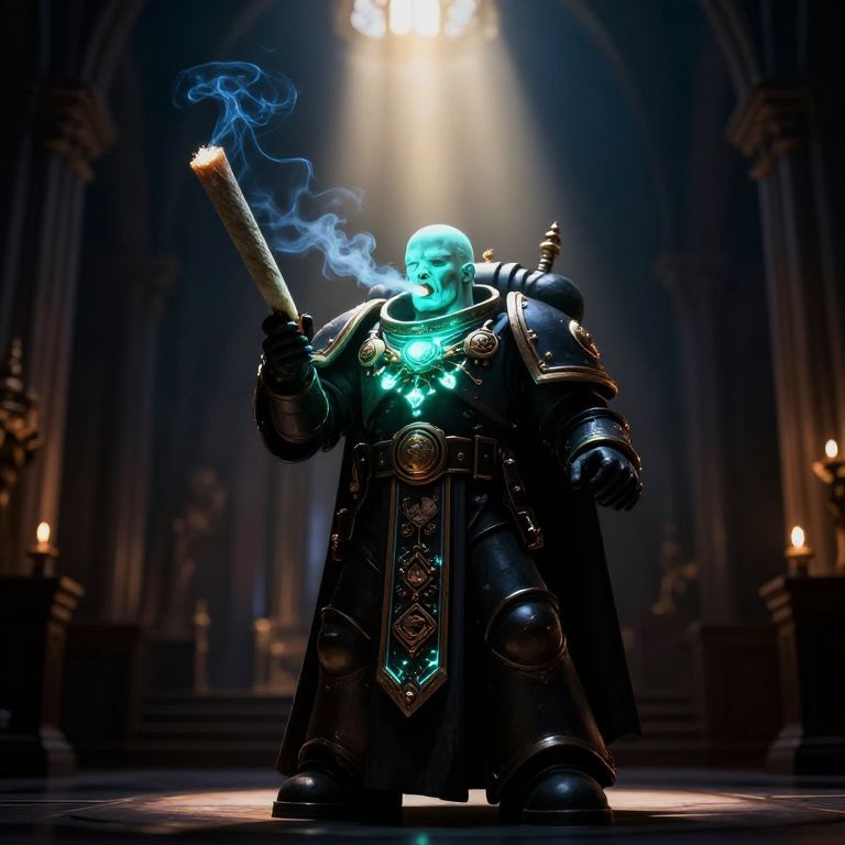 Glow Priest in a church illuminated by a ray of divine light, who smokes a big joint, Warhammer 40k,