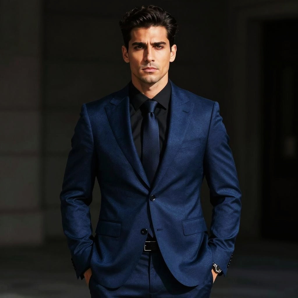 Photograph of a handsome man with short, dark hair and a serious expression, standing against a dark, blurred background. He's wearing a dark blue, textured suit with a black shirt and matching tie. His hands are casually in his pockets, and the lighting creates a dramatic, high-contrast effect, highlighting his strong jawline and confident stance.