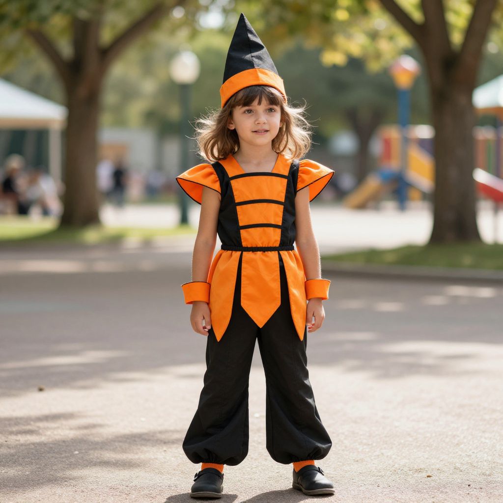 A young girl wearing an vibrant orange and black costume, featuring bold orange accents and black trim, with a pointed black hat adorned with orange details and black pants that fall to her knees. She stands confidently in a sunny park setting, the sunlight casting soft shadows, her expression joyful and curious, with a subtle wind blowing through her hair. The background includes green trees and a colorful playground in the distance, adding to the lively atmosphere.