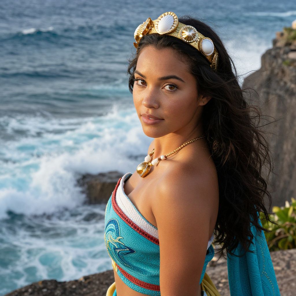 Photograph of a young woman with long, wavy black hair, standing by a rocky coastline with waves crashing in the background. She has a medium brown skin tone and is wearing a turquoise strapless top with red and white stripes, adorned with a blue emblem. She also wears a golden tiara with white pearls and a matching necklace. Her expression is calm and she is looking directly at the camera. The ocean and rocky cliffs are blurred in the background, emphasizing her as the focal point. The image has a vibrant, colorful style.