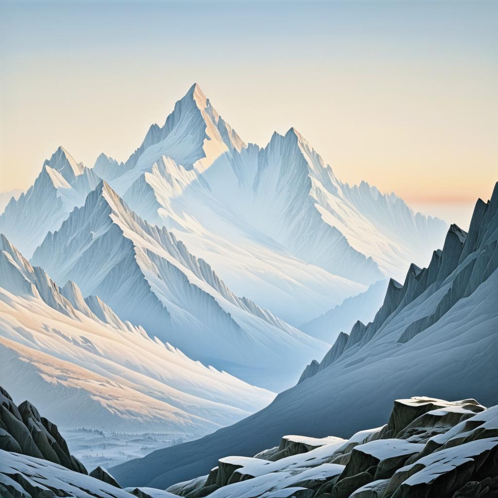 Detailed illustration of snow-covered mountain peaks at dawn, inspired by the Romantic style of Caspar David Friedrich. The serene landscape showcases sharp, jagged peaks illuminated by soft early morning light, emphasizing the tranquil and majestic atmosphere of the scene.