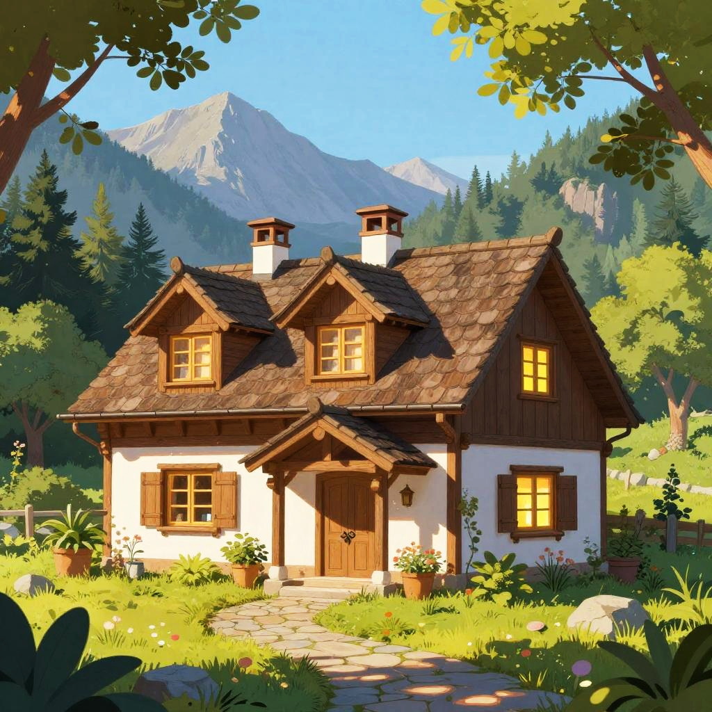 This is a digital illustration of a charming, traditional wooden house with multiple gabled roofs and warm, glowing windows. The house is set in a lush, green garden with a stone path leading to the front door. In the background, there are towering, forested mountains under a clear, blue sky. Sunlight filters through the trees, casting dappled shadows on the grass and house.