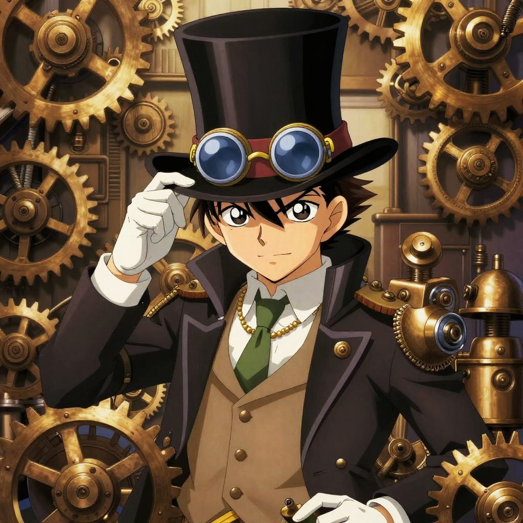 Anime top hat steampunk inventor surrounded by gears and mechanical devices, vibrant workshop background, goggles resting on the brim of the black top hat, warm sepia tone with dynamic lighting highlighting intricate costume details, high detail anime art