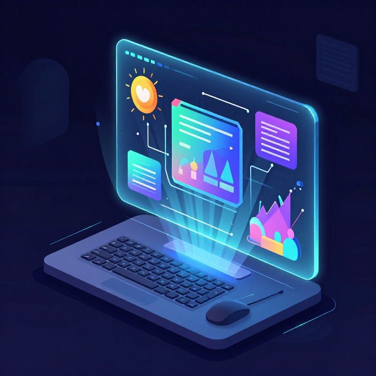 Digital illustration of a glowing, futuristic laptop against a dark background. The laptop's screen displays vibrant, neon-blue and purple charts, graphs, and icons with a sun icon in the top-left corner. Illuminated data points and geometric shapes are visible, casting a blue glow onto the keyboard and mouse. The laptop's sleek, silver body contrasts with the dark surroundings. The overall style is cyberpunk, with neon light effects and a high-tech, virtual interface. The image has a smooth, glossy texture, emphasizing the modern and futuristic aesthetic.