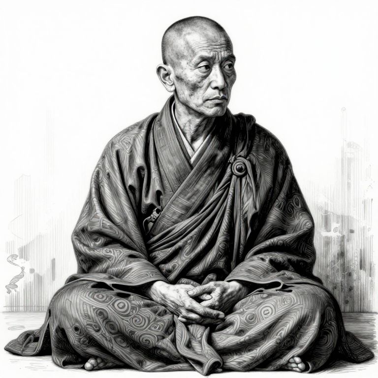 The image depicts a highly detailed, photorealistic India-ink painting of a monk in a traditional kimono. The monk, with a bald head and a weathered face, is positioned in a contemplative pose, gazing to the side. His robe is richly textured, with intricate patterns and folds that add depth and realism to the painting. The background is a stark white, creating a strong contrast with the dark, shadowed areas of the monk's robe and the textured wall behind him. The lighting is reminiscent of Rembrandt's style, with dramatic shadows and highlights that emphasize the monk's features and the folds of his robe. The overall composition is balanced, with the monk centrally positioned and the background elements subtly framing the scene. The image exudes a sense of serenity and contemplation, capturing the essence of the monk's inner world through meticulous attention to detail and texture.