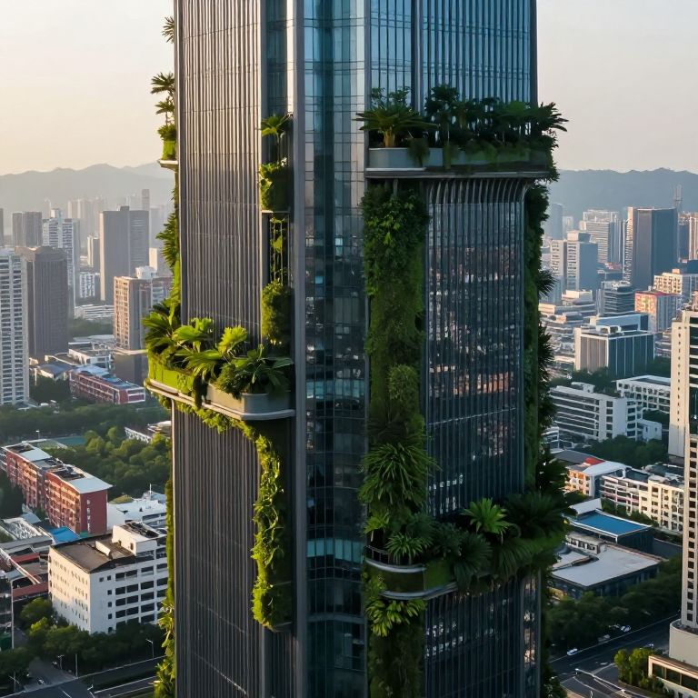 Spiraling vertical gardens ascend a futuristic skyscraper, enveloping its sleek, dark facade with lush greenery as it towers above a sprawling urban landscape bathed in soft sunlight.