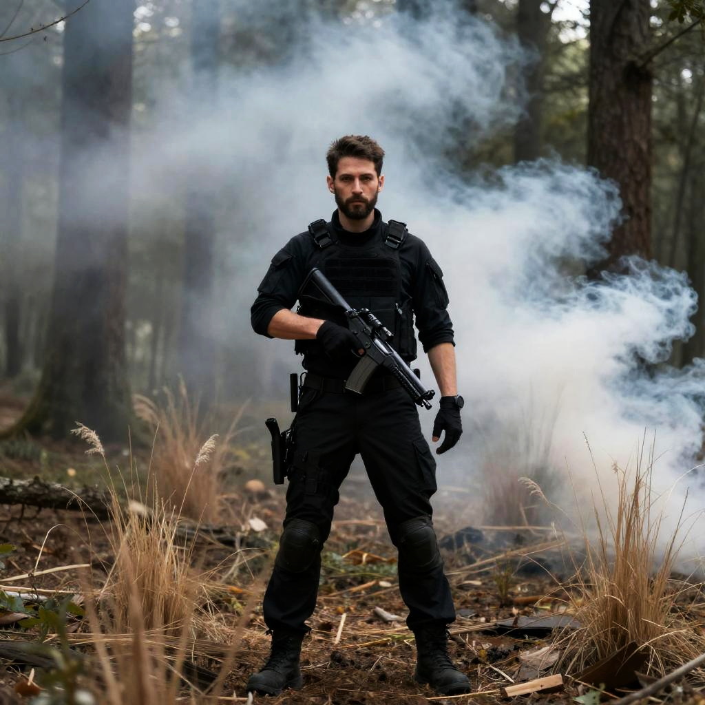 Man with medium-length dark hair and a beard, wearing a ured dark brown jacket, holds a small, glowing, futuristic device in his right hand. He points it forward, concentrated. Forest background with trees and a flowing stream. Device emits a blue-green light. Man's left hand rests on his lap.