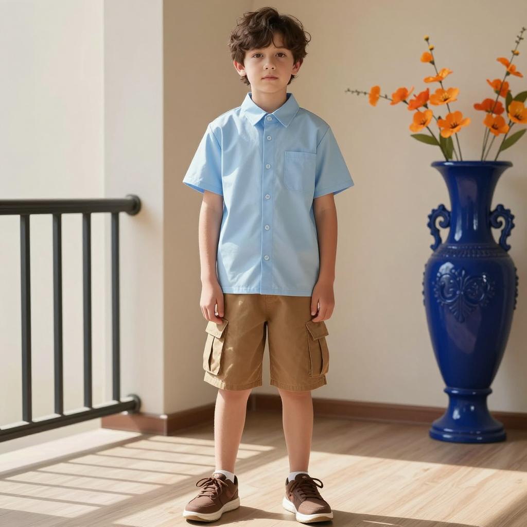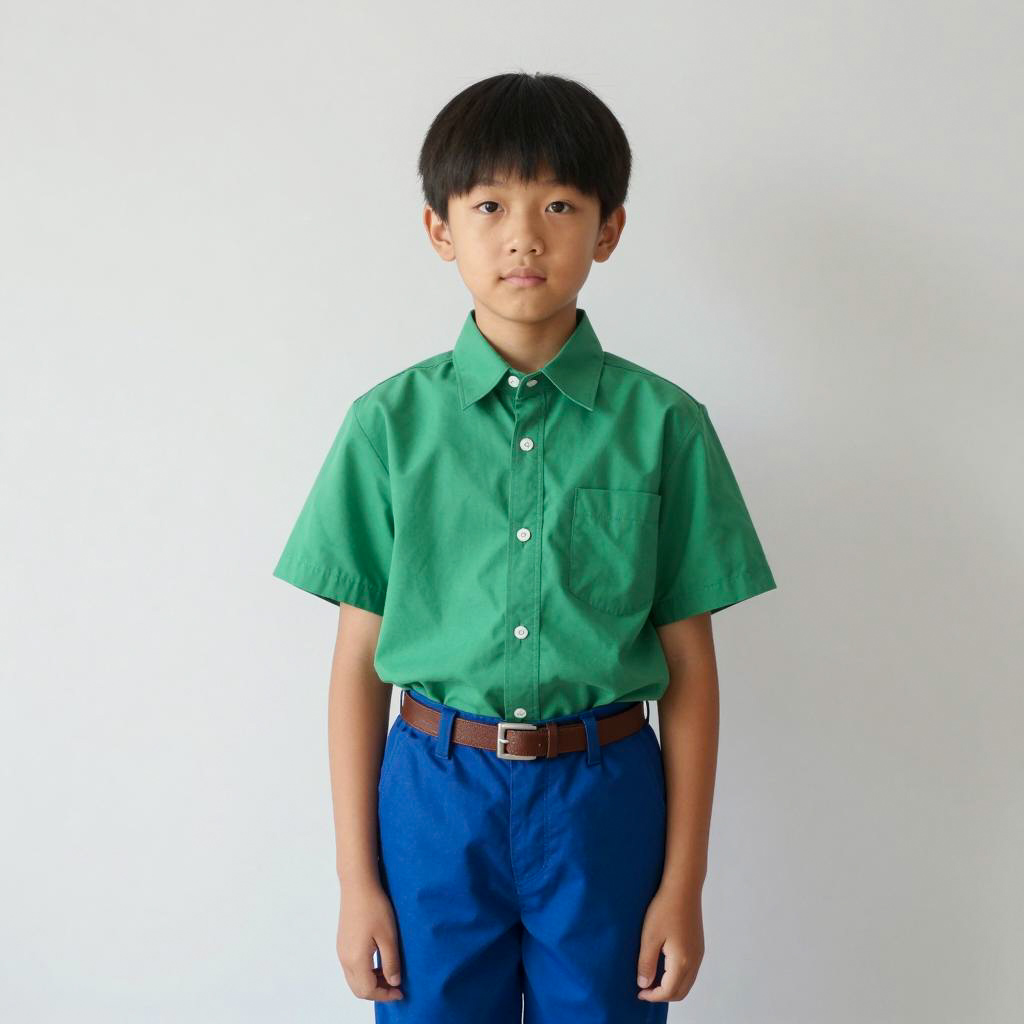 Green shirt blue pants, photograph of a young Asian boy, standing, facing camera, wearing green short-sleeved button-up shirt with chest pocket, blue pants, brown belt, straight black hair, neutral expression, light grey background, daytime, natural light, simple and clean composition, front view, casual attire, school uniform style, medium shot, minimal shadows
