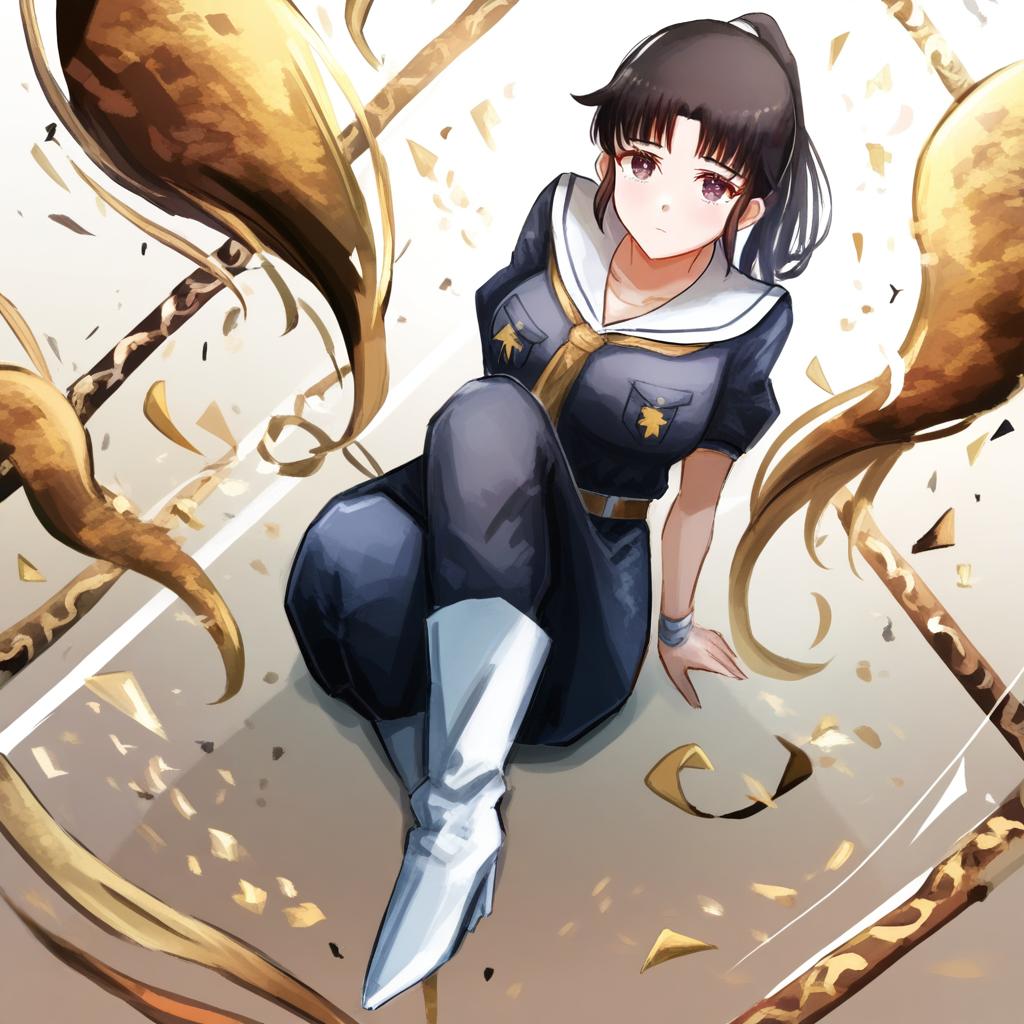 Digital anime-style artwork featuring a young female character with black hair in a ponytail, dressed in a navy blue sailor-style school uniform with a gold tie and white boots. The background is dynamic with golden swirling elements and shards, creating a mystical, energetic atmosphere. The artwork showcases detailed shading and expressive eyes.