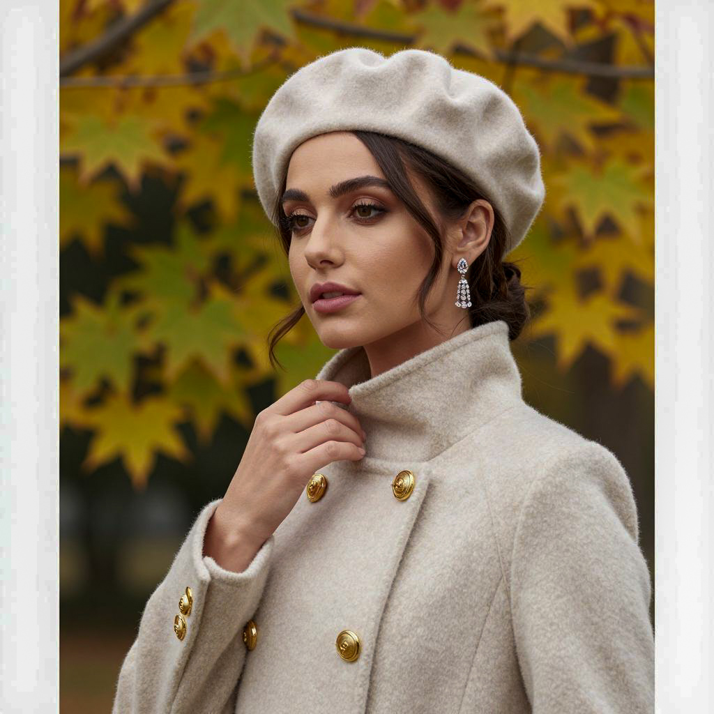 Photograph of a woman in profile, wearing a brown knit beanie, light beige coat, and white turtleneck, standing in a grassy field with autumn trees in the background. She has long dark hair, a ring on her left hand, and a neutral expression. Her right hand touches her chest. The background is blurred.