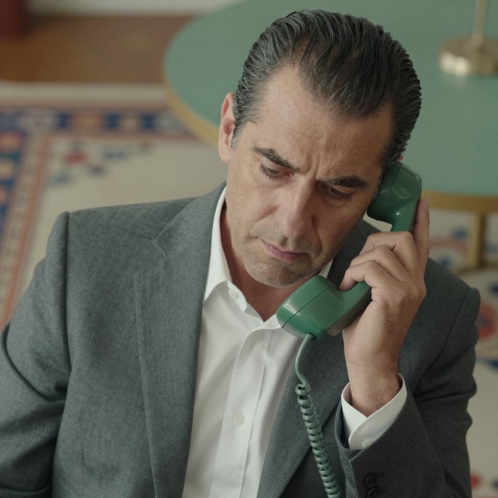Middle-aged man with slicked-back dark hair in a beige suit leaning on a counter, pointing forward. Two round clocks on a wooden wall, black phone on left, "Los Angeles" labels above clocks. Intense expression. Indoor setting.