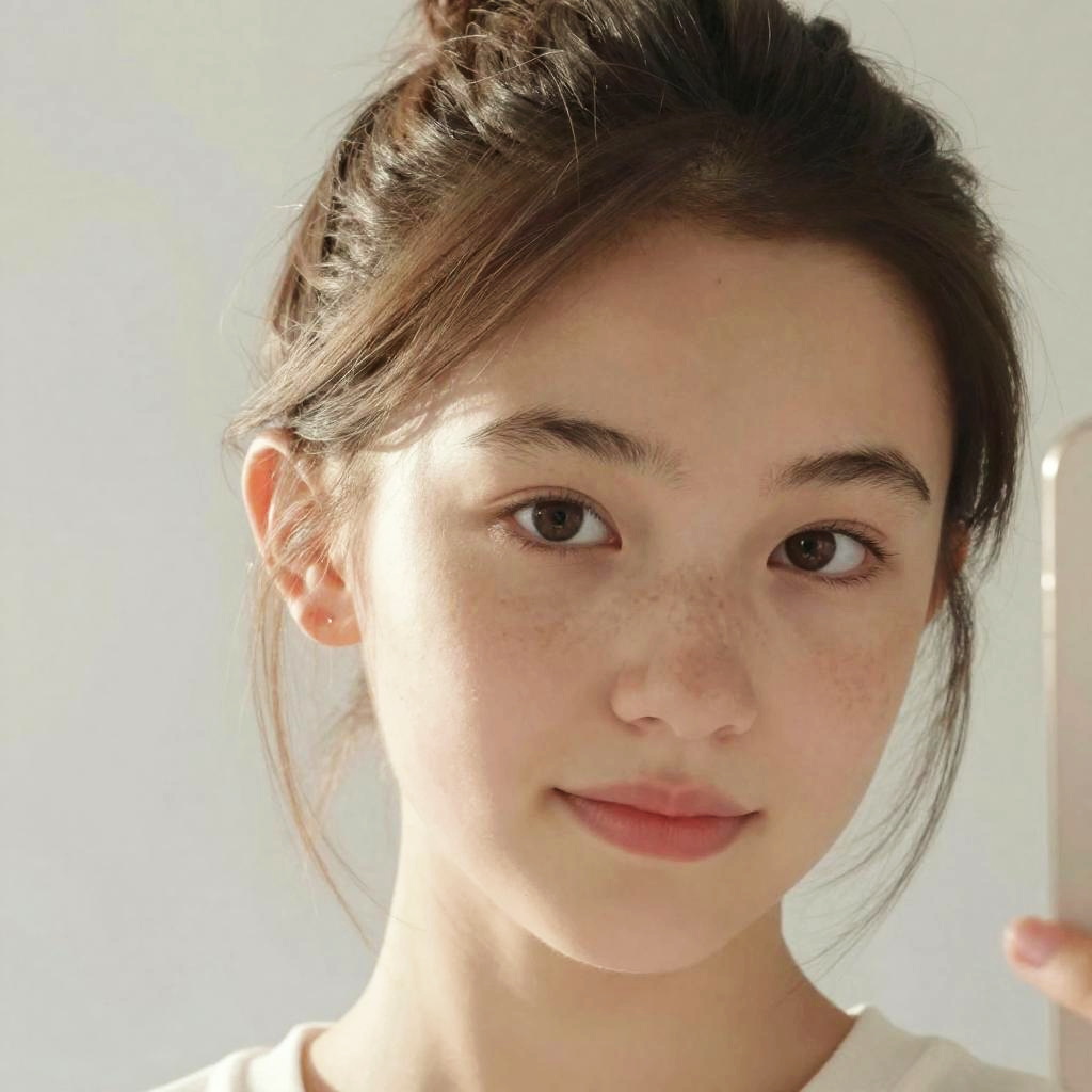 14 year old selfie, bright morning light, soft pastel colors, freckles visible, hair slightly messy, natural makeup, candid and friendly vibe, shallow depth of field