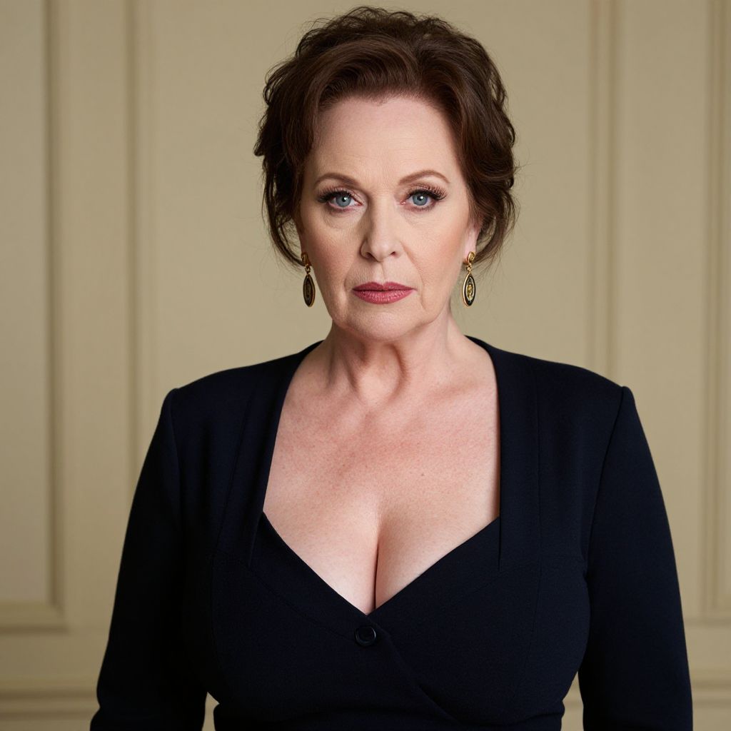 Photograph of a middle-aged white woman with short, wavy brown hair and blue eyes. She has fair skin and wears a black, V-neck blouse that reveals a modest cleavage. She is adorned with small, dangling silver earrings. Her makeup includes dark red lipstick and subtle eyeliner. The background is a plain, beige wall with vertical paneling. The lighting is even, highlighting her facial features and attire. Her expression is neutral, slightly serious. The image has a clean, professional look, focusing on her upper body.