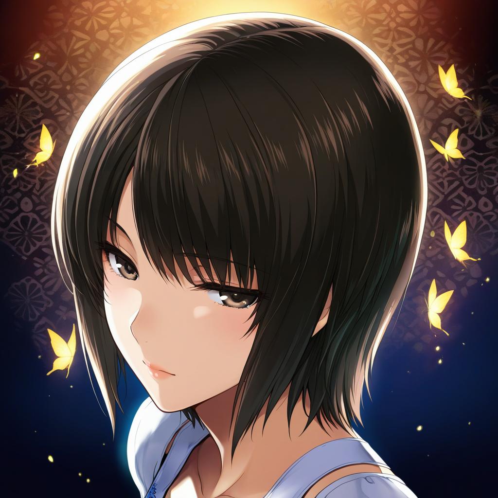 Digital illustration of a young anime girl with short black and brown hair, brown eyes, and soft lips. She is depicted against a decorative background with a warm glowing light and several yellow butterflies flying around her head. The artwork style is detailed and vibrant, capturing a serene and mysterious atmosphere.