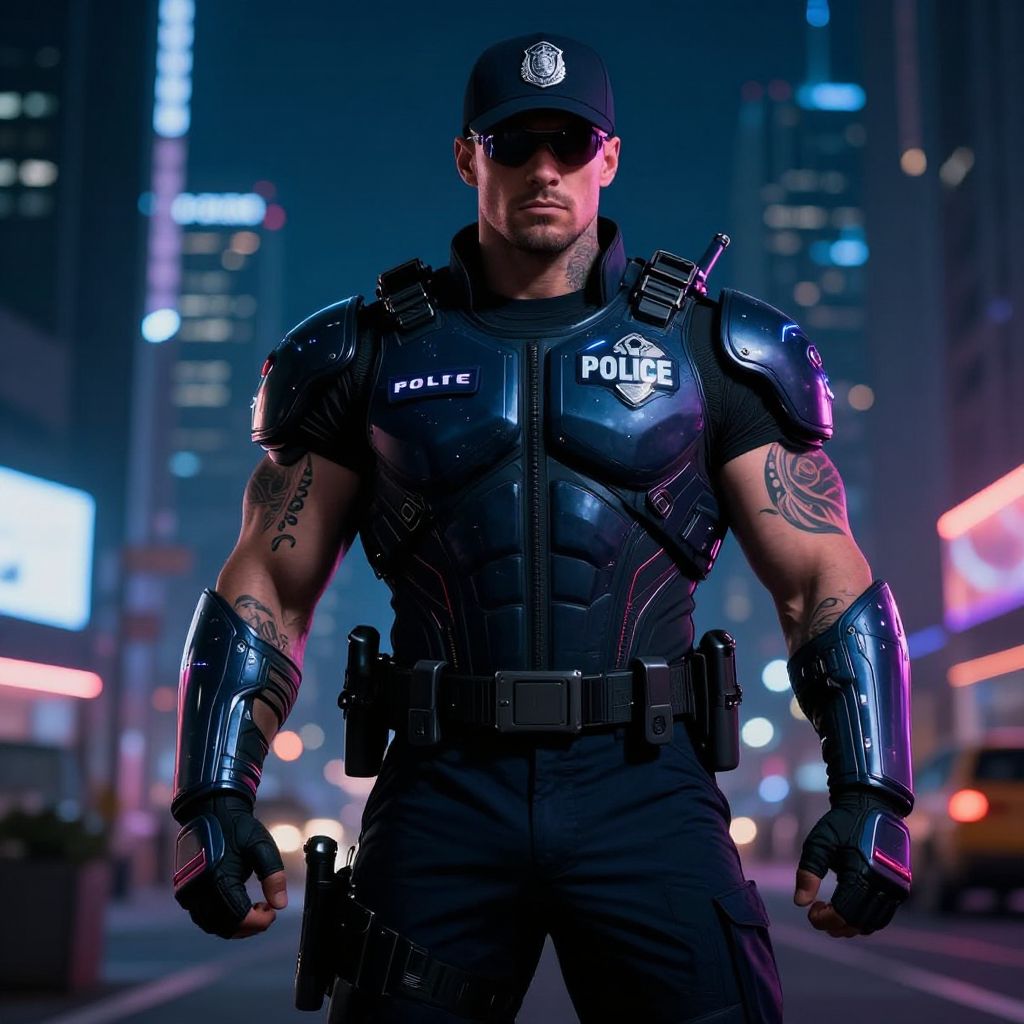 Futuristic police bodybuilder equipped with advanced armor, standing guard in a cyberpunk city, glowing tattoos and tech enhancements, night scene, vivid details
