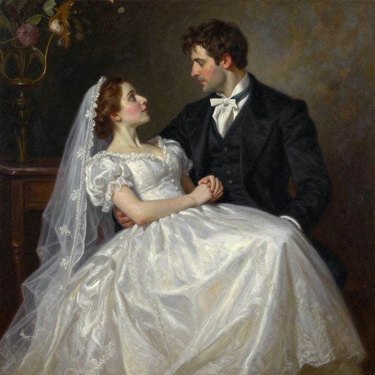 Photorealistic painting of a romantic, Victorian-style wedding couple; bride in white lace gown, veil, and groom in black suit, holding hands.