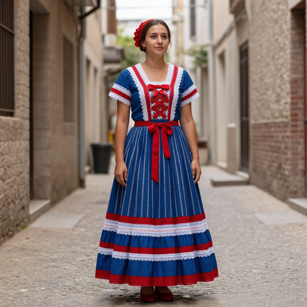 Photograph of a young woman in a traditional Spanish flamenco dress, blue with white lace and red accents, standing in a narrow, cobblestone