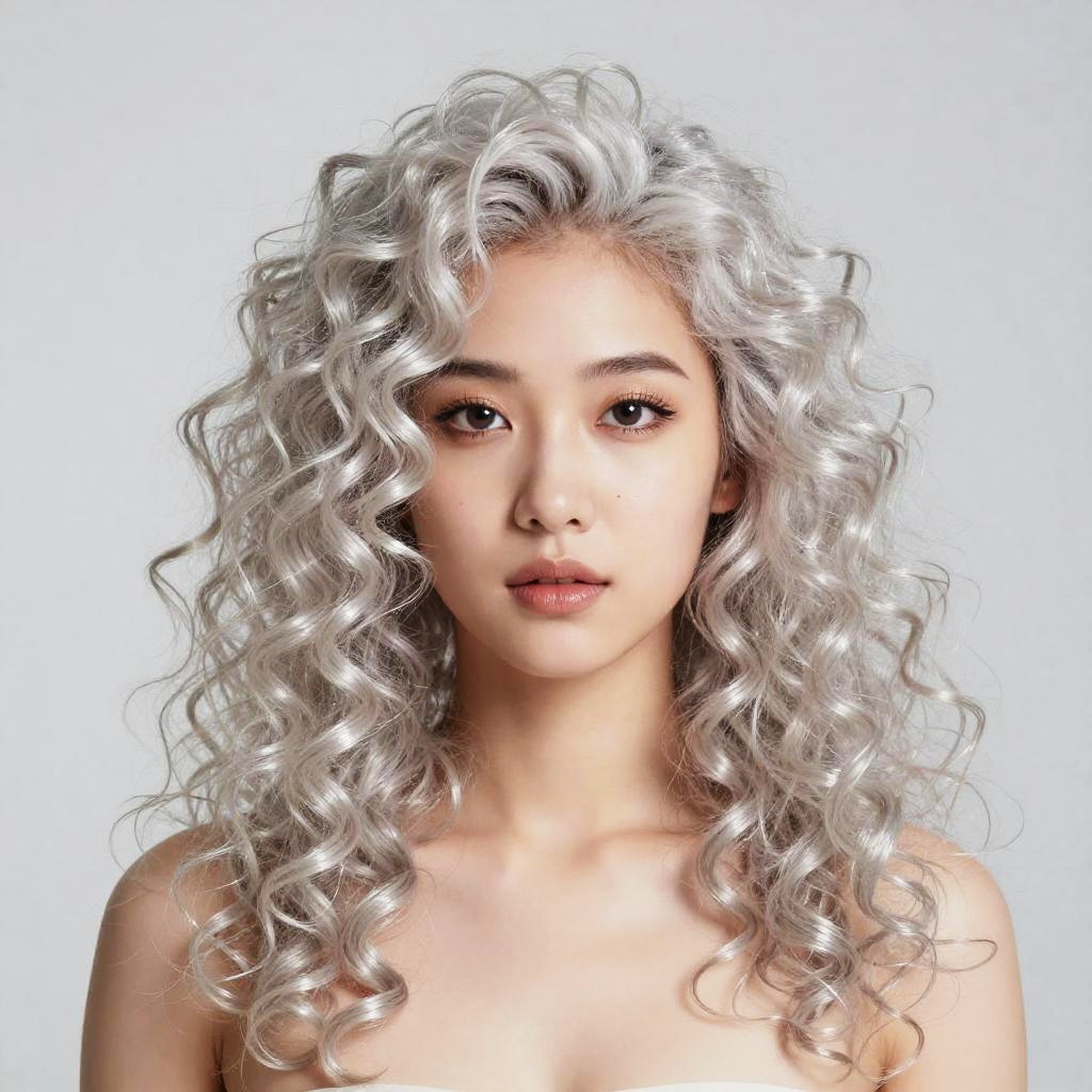 Portrait of a woman with platinum curly hair, shimmering silver highlights, ethereal glow, studio photo style, sharp focus on textured curls, minimalistic background