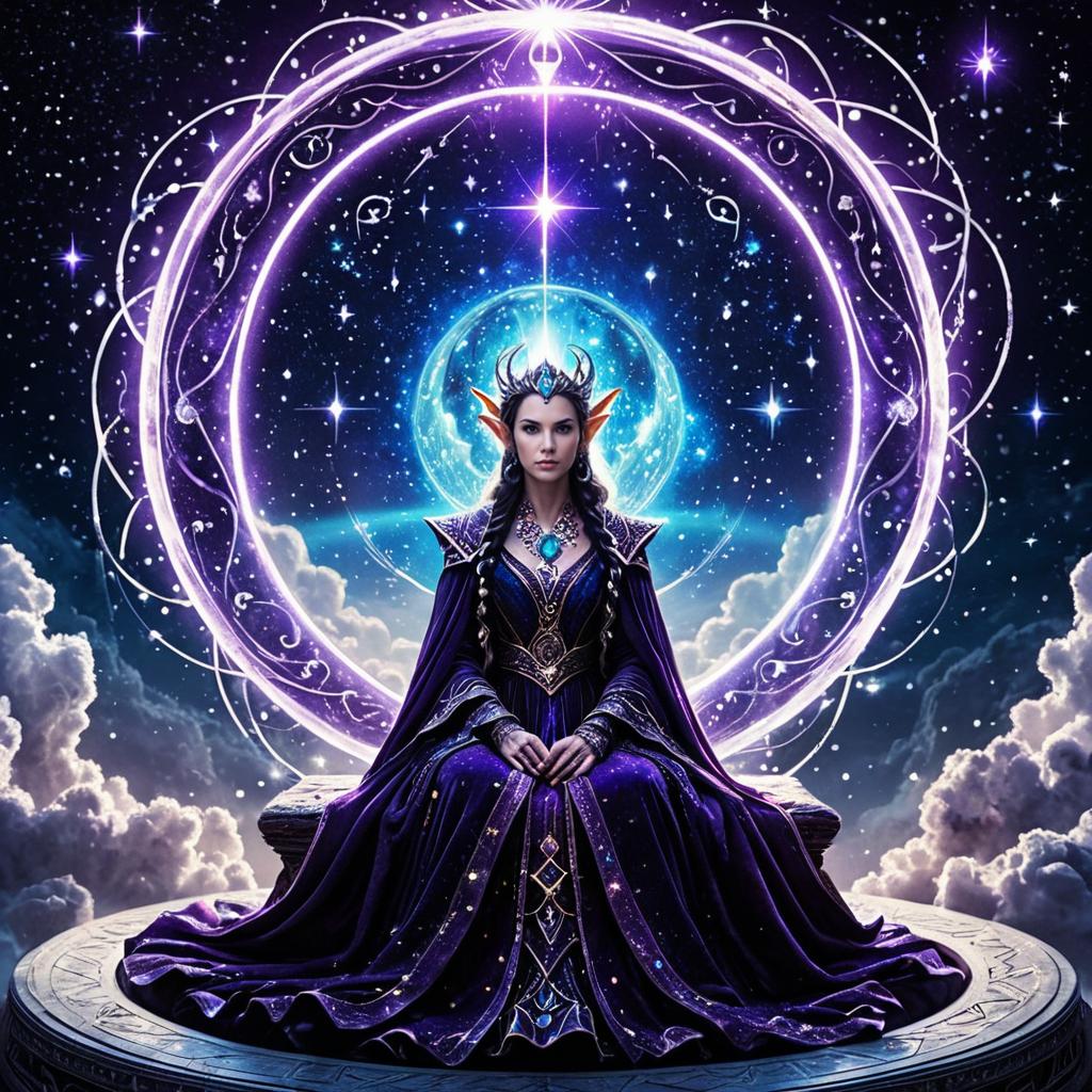 A majestic elf queen seated on a great swirling orb of light serving as her seat, surrounded by a starlit expanse with drifting clouds of cosmic dust, her robe that shimmers like the galaxy with violet and blue hues, adorned with jewelry fashioned from comet fragments and shards of starlight, glowing neon pulsing softly in synced rhythm, mystical and regal atmosphere