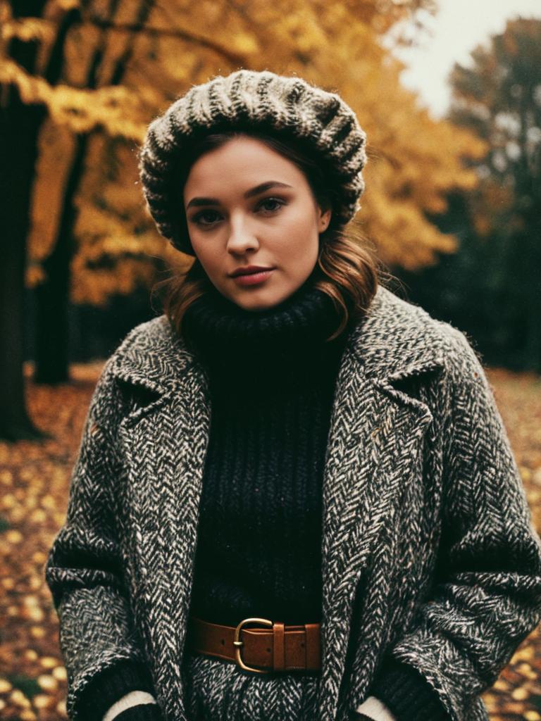 Woman in Vintage Cozy Fall Outfit, cinematic realism, cozy fashion portrait