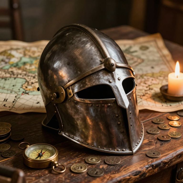 Photograph of a medieval-style, worn, black steel helmet with rivets, positioned on a wooden table. The helmet has a narrow eye slit and a slightly rounded nose guard. Surrounding the helmet are scattered coins and a brass compass with a black and green compass rose. In the background, a lit candle casts a warm, flickering glow. An old, detailed map is partially visible behind the helmet. The overall scene evokes a historical or fantasy setting, with rich, dark brown and gold tones. The texture of the helmet is metallic and slightly tarnished, contrasting with the smooth, aged wood of the table.