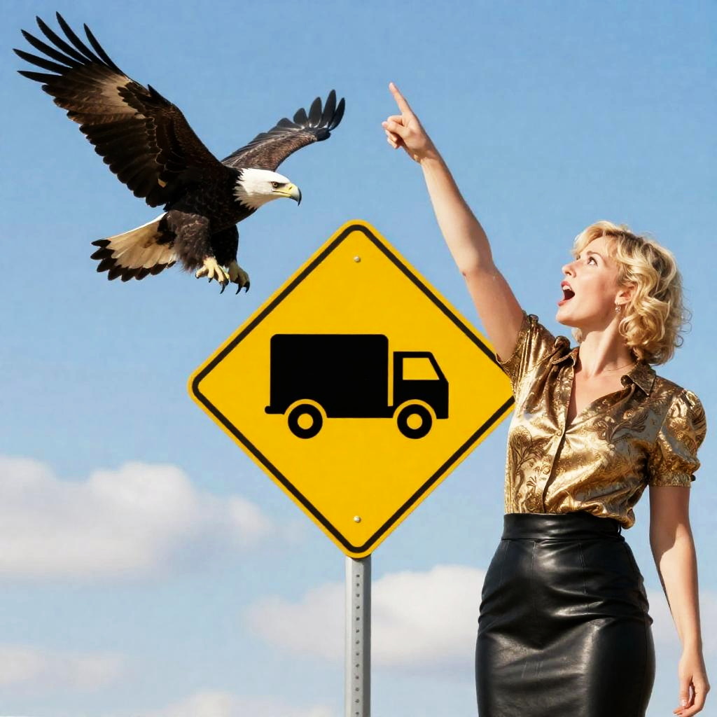 Photograph of a blonde woman with short, curly hair wearing a gold patterned blouse and a high-waisted black leather skirt. She is standing outdoors under a blue sky with white clouds, pointing upwards with one arm raised and an expressive open mouth. A large black bald eagle is seen flying near a yellow diamond-shaped road sign featuring a black truck graphic. The scene captures a dynamic interaction between the woman and the eagle.