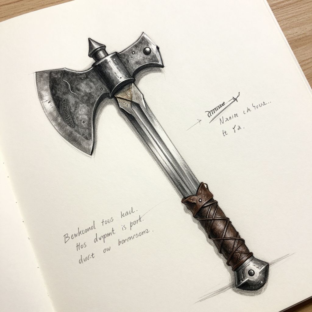 Sword design drawing portraying a rugged Viking axe-sword hybrid, with battle scars and leather-wrapped handle, drawn in charcoal and ink on textured paper with detailed notes on materials and forging techniques.