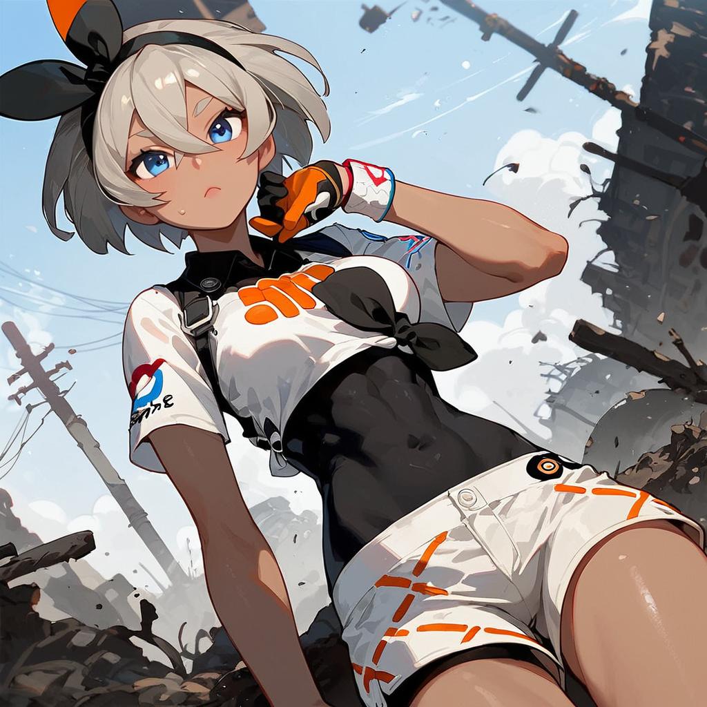 Score_9, score_8_up, score_7_up, source_anime, pokemonbea, blue eyes, dark skin, dark-skinned female, grey hair, hair between eyes, short hair, ribbon, hair ribbon, hairband, black ribbon, black hairband, bodysuit, covered navel, shorts, single glove, glove, crop top, white shirt, short sleeves, collar, white shorts, outdoors, wasteland, looking at viewer, cowboy shot, dutch angle
