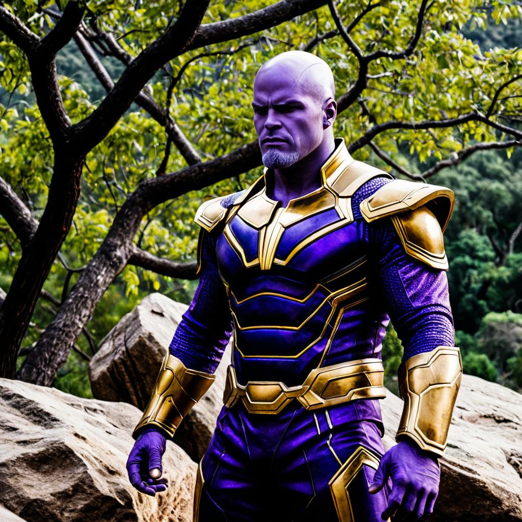 A detailed, realistic portrayal of a male figure dressed in a Thanos costume featuring purple skin and golden armor. The subject is bald with a stern expression, standing outdoors among rocks and green trees, evoking an alien appearance.