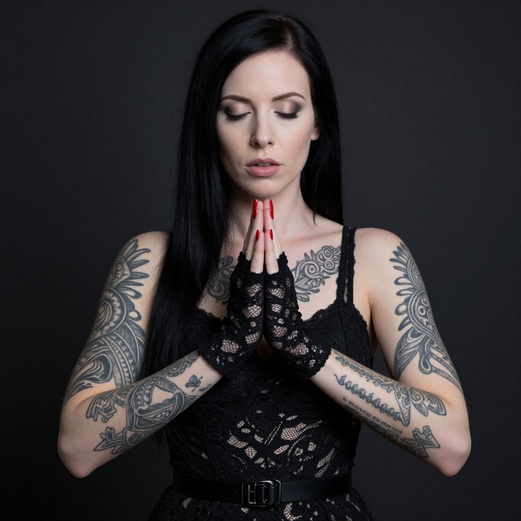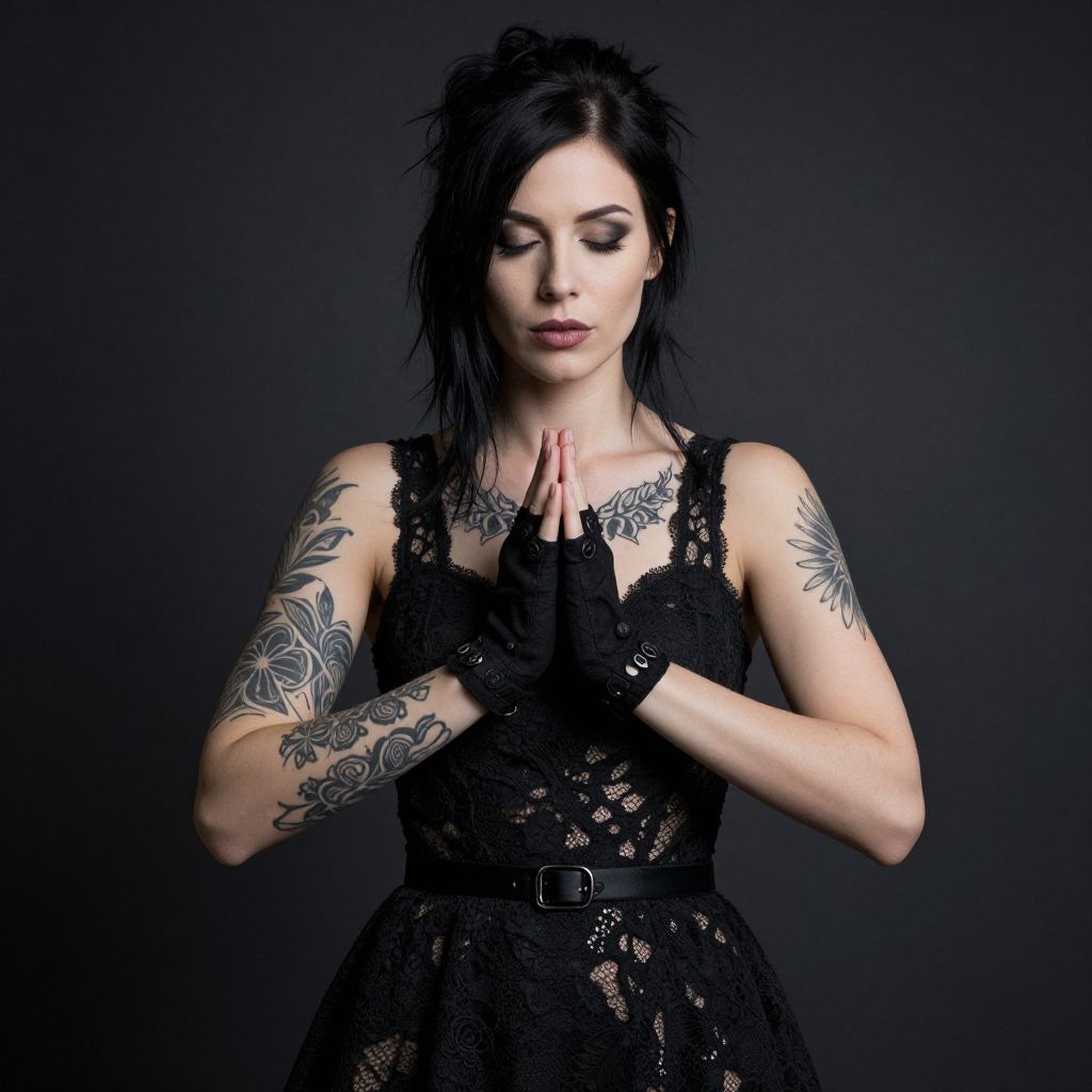 Photograph of a tattooed woman with dark hair in a messy bun, wearing a black lace dress and matching fingerless gloves. She's standing against a dark, smoky background with her hands clasped in front of her chest, eyes closed, and a serene expression. Her arms showcase intricate black tattoos, adding a gothic, edgy vibe to her look.