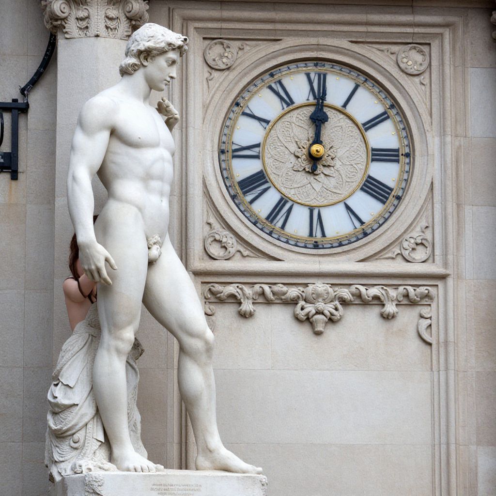 Photograph of a classical white marble statue of a nude male figure with a muscular build, standing in a side profile. The statue is positioned to the left of an ornate, large clock with black Roman numerals and gold accents, set in a stone wall. The man's right arm is relaxed by his side, and his left hand rests on a carved pedestal adorned with floral patterns. The clock's background features intricate carvings. The stone wall has a light beige color, and the overall style is reminiscent of Renaissance or Baroque architecture. The image has a high contrast, almost surreal, brightness.