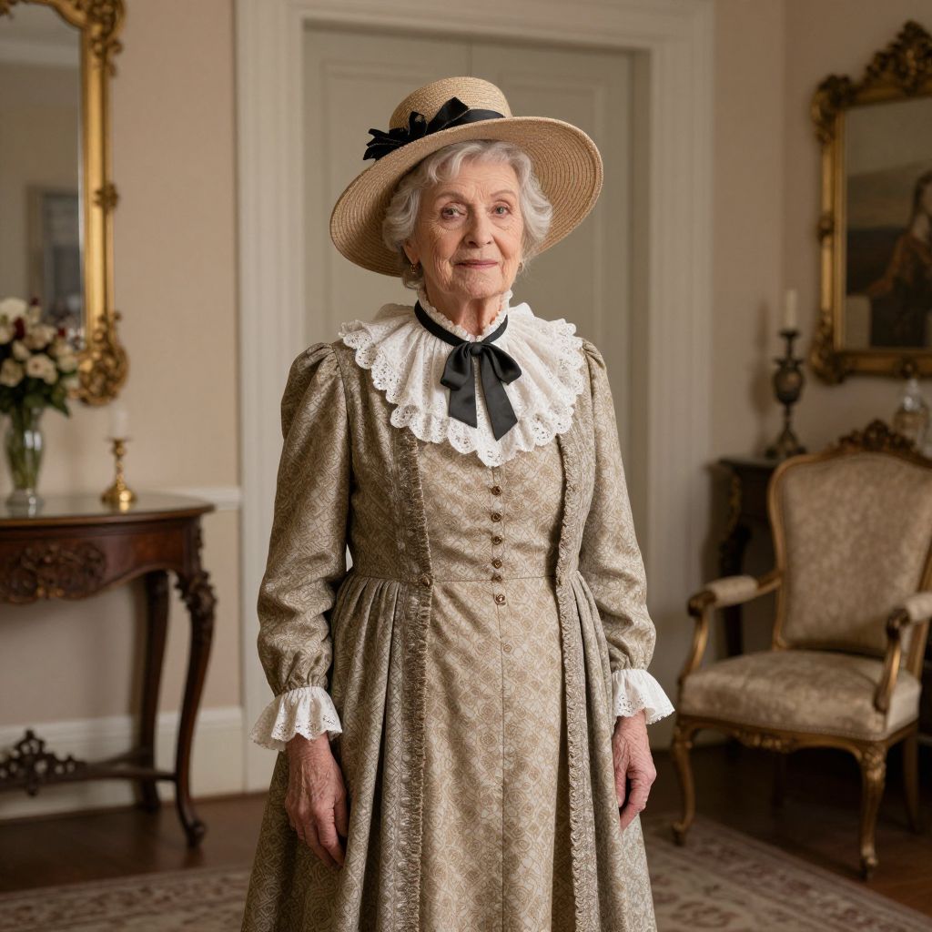 Photograph of an elderly white woman with short gray hair, wearing a Victorian-style beige dress with white lace collar and black ribbon, and a wide-br
